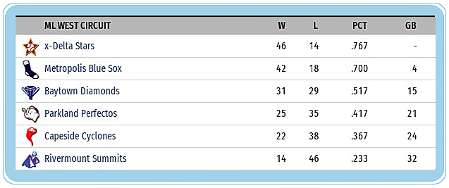 Atlantics (27-10) 3 1/2 games ahead of Solons