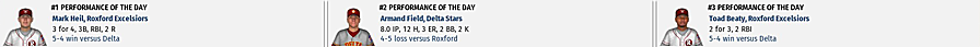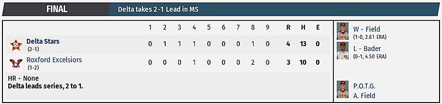 victory, 4-3, over the Roxford Excelsiors in Game 3. Field threw 9.0