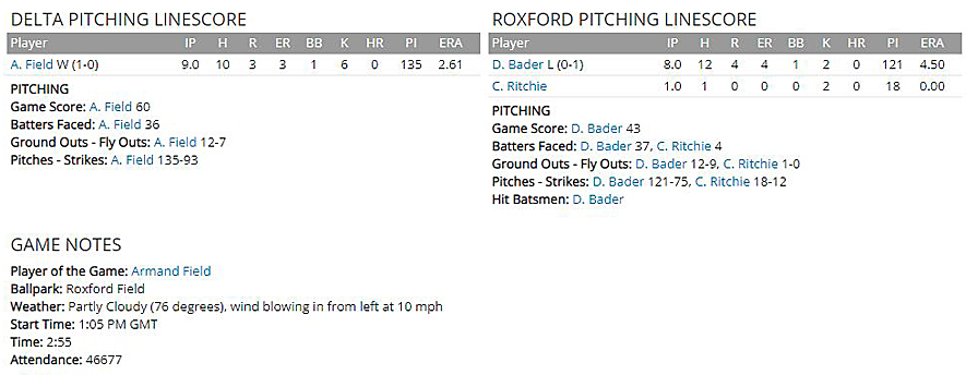 Delta Stars to 7 hits and 1 walk, while striking out 3. The win brought