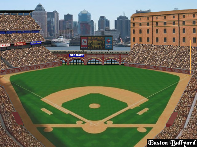 Borrowed the warehouse from Camden Yard and used it as the bases for the design of this fictional ballpark. Gave it a harbor theme (complete with skyline view). Included an outfield wall reminiscent of Pac Bell Park. Sluggers should have fun aiming for the water beyond centerfield. The brick walls surrounding the playing field gives the park a classic flavor.